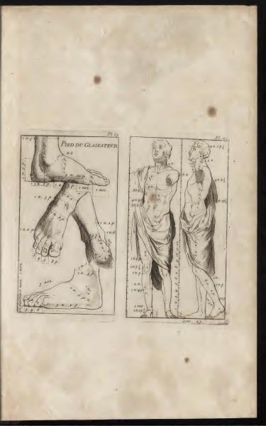 The page features illustrations labeled "Foot of the Gladiator" with measurements. It provides anatomical studies of the human form, likely for educational purposes in drawing and anatomy. The labels and measurements suggest a focus on proportions and classical ideals.