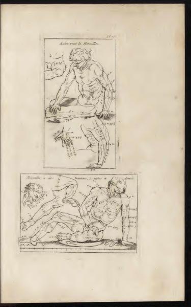 The image features anatomical drawings of a figure referred to as 'Murmillo,' showing another view and providing proportions. It includes two labeled illustrations highlighting the anatomical structure and measurements. The text specifies that the figure is seven and a half heads tall, a classical way of describing proportions in art.