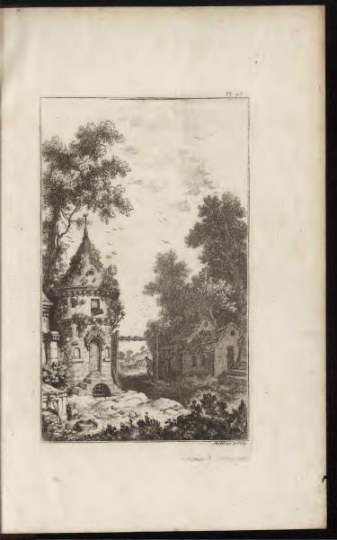 Pl. 68 Page Summary: This is plate number 68 from a book. The page contains an etching of a landscape scene with a small building, trees, and a village in the background. << Go to previous page Go to Beginning of this Book Go to Index of this Book's pages Go to list of Books Go to next page >>