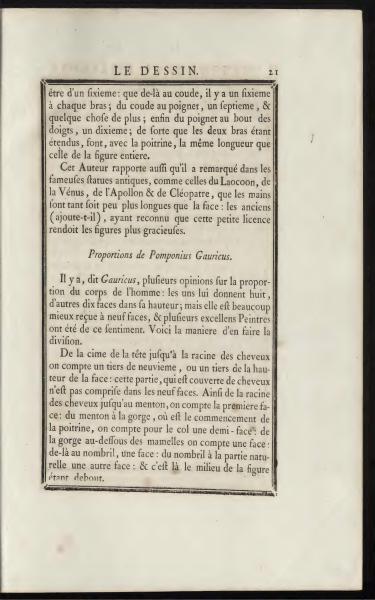 This author also reports that he has observed in the famous antique statues, such as those of Laocoön, Venus, Apollo, and Cleopatra, that the hands are somewhat longer than the face: the ancients (he adds) having recognized that this small liberty made the figures more graceful.