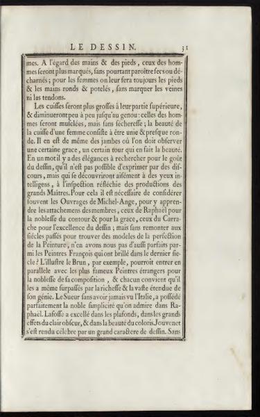 The thighs will be thicker at the top and will gradually reduce towards the knee: for men, they will be muscled but without harshness; the beauty of a woman's thigh consists in being smooth and almost round. The same is true for the legs where one must observe a certain grace, a certain shape which constitutes beauty. In short, there are elegances to seek that cannot be expressed in words, but will be easily discovered by intelligent eyes, through the reflective study of the works of great Masters. To achieve this, it is essential to frequently consider the works of Michelangelo, to learn about the attachment of limbs, those of Raphael for the nobility of contour and grace, and those of the Carracci for excellent drawing; but without reverting to past centuries to find models of perfection in painting, do we not have equally perfect ones among the French painters who shone last century? The illustrious Le Brun, for example, could be compared with the most famous foreign painters for the nobility of his composition; and it is agreed that he even surpassed them with the richness and vastness of his genius. Le Sueur, without ever having seen Italy, perfectly possessed the noble simplicity admired in Raphael. Lafosse excelled in ceilings, in the grand effects of chiaroscuro, and in the beauty of coloring. Jouvenet became celebrated for a great character of drawing. Without