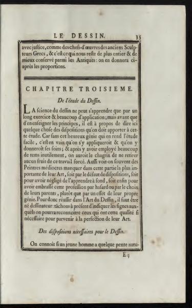 The art of drawing can only be learned through extensive practice and dedication; but before teaching the principles, it is fitting to discuss the dispositions one must bring to this study. Without the fortunate natural talent that makes the study easier, it is vain to apply oneself to it, and despite dedicating much time to it, one might regret not reaping any benefits from forced labor. It is often seen that mediocre painters fail in this most crucial part of their Art, either from a lack of predispositions, neglecting thorough learning, or embracing this profession by accident or parental choice, rather than from their own innate talent. Thus, to succeed in the Art of Drawing, one must be born a draftsman: let us now endeavor to indicate the signs by which one can recognize those who possess this quality so necessary to reach perfection in their Art.