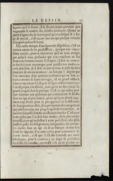 This passage discusses the traits necessary for success in drawing, emphasizing that effort alone cannot surpass mediocrity without innate talent. A love for one's creations is crucial, but it must not blind one to progress. It advises starting the practice of drawing at a young age to avoid discouragement from early imperfections, as drawing requires a long and dedicated period of study to achieve excellence.