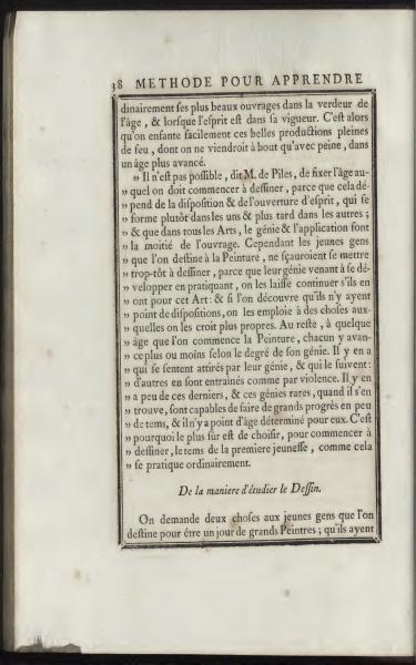 "It is not possible," says M. de Piles, "to determine the right age to start drawing, as it depends on one's disposition and openness of mind, which develops earlier in some and later in others; and in all the Arts, genius and diligence make up half the work. However, young people destined for Painting cannot start drawing too early, because as their genius develops with practice, they are allowed to continue if they possess an affinity for this Art: And if it is discovered that they have no inclination for it, they are directed to activities for which they are believed more suitable. Regardless of the age at which one begins Painting, everyone progresses at varying speeds depending on their level of genius. Some are naturally drawn by their genius and follow it; others are carried along almost by force. There are few of the latter, and these rare geniuses, when found, are capable of making great advances in a short time, and for them, there is no set age. Therefore, it is safest to choose to start drawing at a young age, as this is commonly practiced.