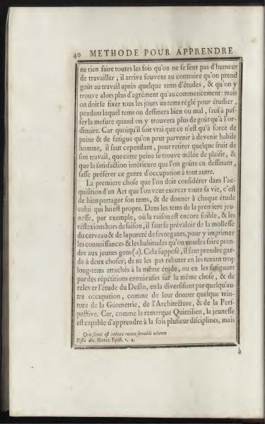 The first thing to consider in acquiring an art you wish to practice throughout your life is to allocate your time well, giving each study its proper duration. For young people, whose reasoning is still developing and who lack timely reflections, leverage the brain's flexibility and organ purity to instill the knowledge and habits they should acquire (a). It is important to avoid discouraging them by keeping them attached too long to the same study or tiring them with tedious repetitions. Revitalize the study of drawing by varying it with other occupations, such as offering some exposure to geometry, architecture, and perspective. As Quintilian observes, youth is capable of learning several disciplines at once, but