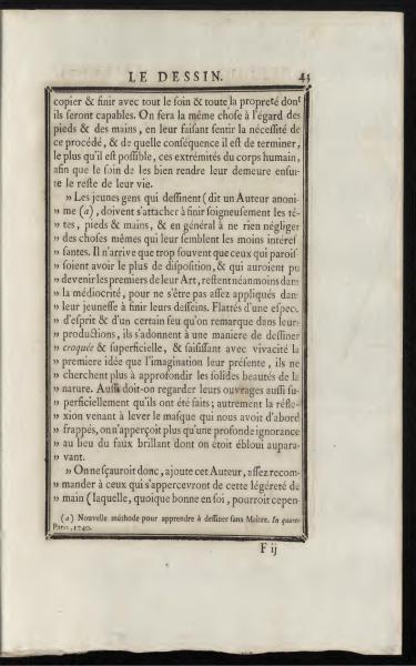 Young people who draw (says an anonymous Author (a), should focus on carefully finishing the heads, feet, and hands, and in general not neglecting even those things which seem to them the least interesting. It happens only too often that those who seem to have the most disposition, and who could have become the foremost in their Art, nevertheless remain mediocre because they did not apply themselves enough in their youth to finish their drawings. Flattered by a kind of spirit and a certain fire noticeable in their works, they devote themselves to a manner of sketching that is rough and superficial, and seizing with vividness the first idea that the imagination presents to them, they no longer seek to delve into the solid beauties of nature. Hence, one should look at their works as superficially as they were made; otherwise, reflection comes to lift the mask that initially struck us, and we perceive nothing but profound ignorance instead of the false brilliance by which we were dazzled before.