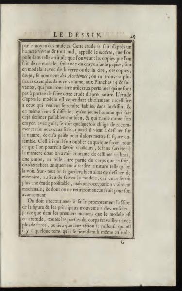 through the use of muscles. This study is done from a living and fully nude man, called the model, whom one poses in whatever position one wishes: the copies made from this model, whether with a pencil on paper, or by modeling with clay or wax, these copies, I say, are called Academies; several examples of which can be found in this volume, on Plates 39 and following, which may be useful to people who are not able to do this study from nature. However, the study from the model is absolutely necessary for those who want to become skilled in drawing, and at the same time, it is difficult, that a young person who already knows how to draw quite well, and even handles his pencil with taste, finds himself sometimes obliged to start afresh when he comes to draw from nature, and hardly can he then put his figure together. This is where one must somehow forget everything else one may know, and without stopping at the manner in which one used to draw an arm, a leg, or any other part of the body, one will focus solely on rendering nature as one sees it. Above all, one must not draw from memory then, instead of following the model, because that would no longer be a profitable study, but a truly mechanical occupation from which one would not gain any benefit for their advancement.