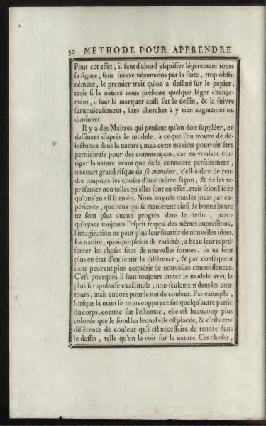 Some Masters think that one must correct what seems defective in nature when drawing from a model; however, this principle can be harmful for beginners, as trying to improve upon nature before fully understanding it runs the risk of becoming stylized—rendering things in an unvaried way and representing them not as they truly are, but rather based on preconceived ideas. We observe daily that those who become set in this way early on cease to progress in drawing, because their mind, always marked by the same impressions, can no longer be inspired with new ideas. Nature, though full of variety, may present things in new forms, but they can no longer perceive the difference, and as a result cannot acquire new knowledge. Therefore, one must always imitate the model with the utmost precision, not only in contours but also in the tone of color. For example, when the hand is resting on another part of the body, like the stomach, it is much more colored than the background it is placed on, and it is this color difference that must be rendered in the drawing, just as it appears in nature. These things,