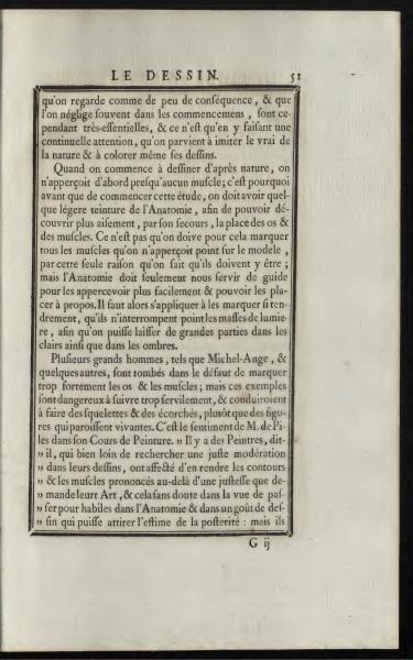 Several great artists, like Michelangelo and others, have made the mistake of marking bones and muscles too strongly. However, following such examples too strictly is dangerous, as it might lead to creating skeletons and skinned figures, rather than lifelike images. This is the opinion of Mr. de Piles in his Painting Course: "There are painters," he says, "who, far from seeking a just moderation in their designs, have insisted on making contours and muscles more pronounced than proper for their Art. This is likely done to appear skillful in Anatomy and in a design taste that could attract the admiration of posterity, but they..."