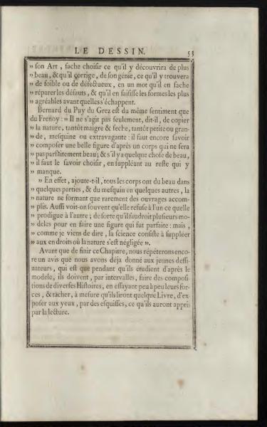 His art requires choosing what is most beautiful and correcting, with his genius, what is found to be weak or defective. In essence, one must repair the faults and capture the most pleasing forms before they escape notice. Bernard du Puy du Grez shares the same sentiment as du Frenoy: "It is not only a matter," he says, "of copying nature which can sometimes be thin and dry, small or large, unimpressive or extravagant. It's necessary to know how to compose a beautiful figure from a body that isn't perfectly beautiful, and if there is anything beautiful, one must know how to choose it, compensating for what is missing.