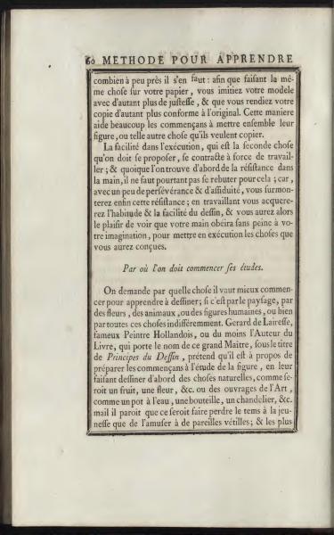 It is asked with what one should begin to learn drawing; whether it's landscapes, flowers, animals, or human figures, or whether it's indifferent among these things. Gerard de Lairesse, a famous Dutch Painter, or at least the Author of the Book, which bears the name of this great Master, under the title Principles of Drawing, claims it is appropriate to prepare beginners in studying the figure, by first having them draw natural objects, such as a fruit, a flower, etc. or works of Art, like a water pot, a bottle, a candlestick, etc. but it seems this would waste time for the youth, amusing them with such trifles; and the most