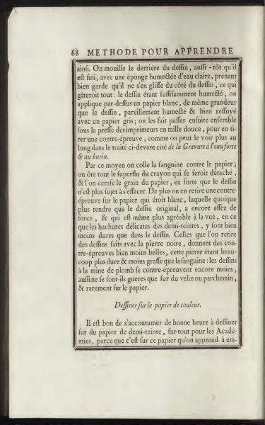 Thus, you moisten the back of the drawing as soon as it is finished, with a sponge moistened with clear water, being careful not to let any slip onto the front of the drawing, which would ruin everything: once the drawing is sufficiently moistened, a white paper of the same size is laid on top, also moistened and well pressed with a gray paper; they are then passed together under the engravers' press for intaglio printing, to produce a counter-proof, as can be read at length in the aforementioned treaties on Etching and Engraving.
