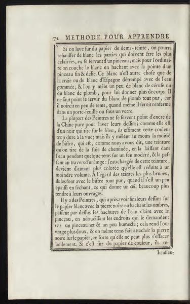 There are painters who, after completing their drawings on white paper with blackstone by hatching the shadows, go over the hatchings with a brush moistened with clear water, smoothing the areas that require it, using a clean and slightly damp brush; this makes the work softer, and at the same time makes the blackstone adhere to the paper so that it cannot easily be erased. If it is on colored paper, they enhance...
