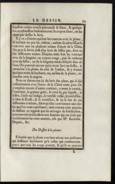 The text discusses techniques for drawing, including the use of various tools and shading techniques such as washes with Chinese ink, bistre, and sanguine. It advises different methods for creating outlines and shading, tailored for more experienced artists versus beginners. The document also mentions specific pigments and suggests consulting other authors for more specialized topics in drawing related to fortifications.