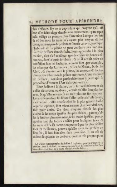 There are some who believe it is useful to practice in the beginning because it forces more attention to what is being done, and where lines are drawn, as there's no way to correct them: however, few people share this opinion, as the practice with the pen can only lead to a hard and dry way of drawing. To learn to use it well, nothing is better than copying good prints, with beautiful engraving, and where there is no confusion in the hatching, such as, for example, the prints of the Carracci, Melan, and Le Clerc; and to imitate with the pen, the contours and the hatches that the burin or the point have traced. This manner of drawing is particularly suitable for those who intend to practice the Art of Engraving (a).