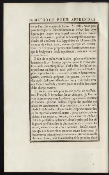 There was a time when the majority of our French Painters trained themselves on this Antique, and one can see the proof through their Academies, which appeared as many Herculeses, although defined according to models that certainly did not have this character, or these forms. From there resulted paintings or sculptures that were mannered; they were regarded as learned, because they resembled a learned piece; but it was a real obstacle to the perfection of their art, whose main purpose is to please through the most perfect imitation of nature. The truth, even in an ordinary choice, satisfied more than these beautiful dreams which have no foundation. It would be even better no doubt to combine this truth with the best choice; but its imitation is the first thing.