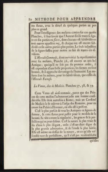 The Hercules Commodus, whose representation with its measurements is seen here, Plate 56, is still a very fine Antique; though it is not of the first order, it is nonetheless beautifully proportioned; its shapes are good, and it approaches humanity more closely. The measurements are the same, for the subdivisions, as those of the Farnese Hercules.