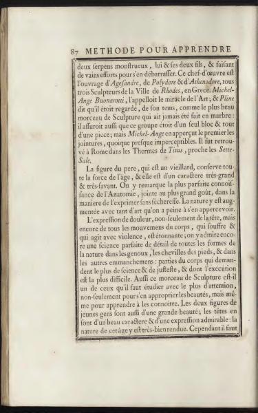 The expression of pain, not only in the head, but also in all the movements of the body, which suffers and acts violently, is astonishing; there is also perfect knowledge in the detailing of all natural forms in the knees, the ankles of the feet, and other joints: parts of the body that require the most knowledge and precision and are the most difficult to execute. This piece of sculpture is therefore one that must be studied with the utmost attention, not only to acquire its beauties but also to learn to know them. The two figures of young people are also of great beauty; their heads have a beautiful character and admirable expression: the nature of this age is very well rendered. However, it is necessary.
