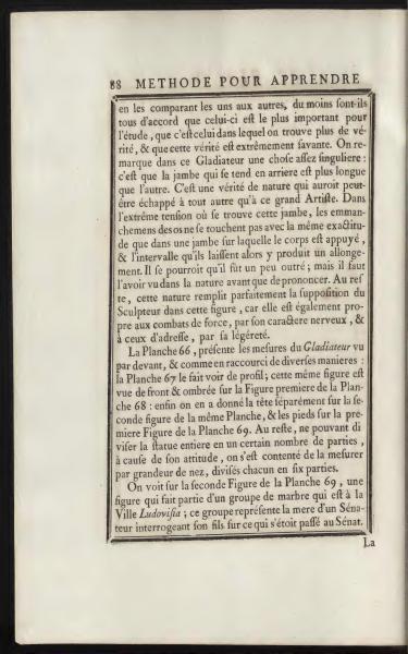 Plate 66, presents the measurements of the Gladiator seen from the front, and in foreshortening in various ways: Plate 67 shows it in profile; this same figure is seen from the front and shaded in the first figure of Plate 68: finally, the head is given separately in the second figure of the same Plate, and the feet on the first Figure of Plate 69. Moreover, not being able to divide the entire statue into a certain number of parts, due to its posture, it was content to measure it by nose length, each divided into six parts.