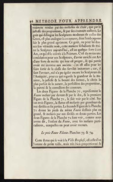 The two figures in Plate 70 represent the Faun measured from the front and the back, and the first figure in Plate 71 shows it from the side. In these three figures, the statue is measured by dimensions divided into six parts. The second figure in Plate 71 shows the feet of the same Faun drawn larger, and measured by dimensions divided into twelve parts. The two figures in Plate 72 show, as we said, the child of the Faun, with its particular measurements, which can be referred to.