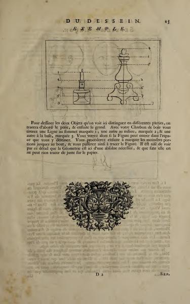 To draw the two objects seen here, distinguish them into different parts. One will first sketch the small one, and then the large one. With your charcoal stick, draw a line at the top marked 1, another at the middle marked 2, and another at the base marked 3. You will then see if the figure can fit within the intended space. Next, proceed to mark the smallest portions to the end, and this way you will manage to draw the figure. It is easy to see from this detail that Geometry is of absolute necessity here, and without it, nothing can be accurately drawn on the paper.