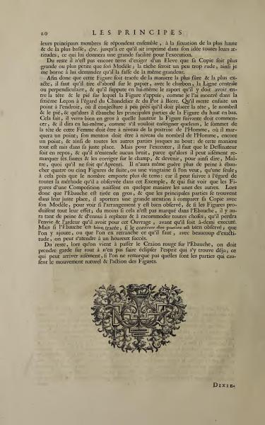 Therefore, so that this figure may be traced in the most sure and exact manner, they must first draw on the paper, with charcoal, the central or perpendicular line, and estimate in themselves the proportion that should exist between the head and the foot on which the figure rests; as I have shown previously in the sixth lesson regarding the chandelier and the beer mug. Then, they should place a point at the location where they estimate approximately where to place the head, the navel, and the foot, and then sketch the main parts of the figure from top to bottom. Having done this, they will see roughly at what height the next figure should begin, and will say to themselves, as if teaching someone, the top of this woman's head should be level with the chest of the man, where they will mark a point; their chin should be level with the man's navel, another point; and so on for all other parts until the end: in this manner, everything is put in its proper place. But to execute it, the draftsman must be in a state of rest, and hear no noise, because only then can they easily observe their mistakes and correct them immediately, and become, so to speak, a master, even though they are but an apprentice. They will scarcely have more difficulty sketching four or five figures in succession, or a dozen if desired, than a single one; except that the number takes more time: for they can follow with regard to all the method they have observed in this example, and which shows that the figures of a composition somewhat emerge from one another. Therefore, once the rough sketch is drawn, and the main parts are in their proper place, they will pay great attention to compare their copy with their model, to see if the arrangement is well observed, and if the figures produce all their effect; at least if this is not marked in the rough sketch, there will be so much trouble and boredom in replacing and fixing everything that they will lose the desire and enthusiasm they had for this work, even before it is half completed. But if the rough sketch is well traced, if the contour of the parts is well observed, and if there is a precise addition or subtraction of what is needed, one can expect a successful outcome.