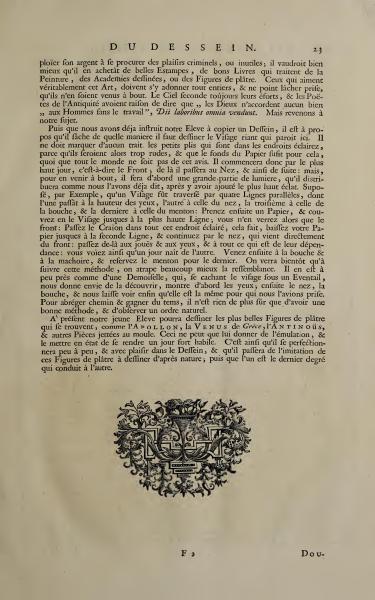 Spending money on criminal or useless pleasures is unwise; it would be much better to purchase beautiful engravings, good books on Painting, established Academies, or plaster figures. Those who truly love this Art should dedicate themselves fully and not give up until they have mastered it. Heaven always supports their efforts, and the Ancient poets were right to say "the Gods grant no good to Men without work," Dii laboribus omnia vendunt. Let’s return to our subject.