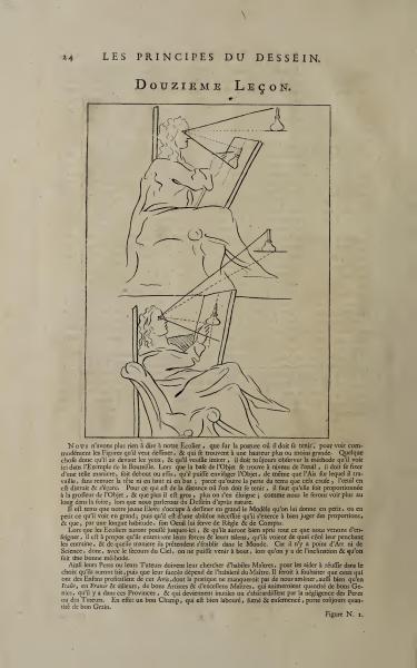 We have nothing more to say to our Student, except about the posture they should adopt to conveniently see the Figures they wish to draw, whether they are positioned at varying heights. Whatever they have before their eyes and wish to imitate, they must always observe the method shown in the Bottle Example. When the base of the Object is level with the eye, they should position themselves, either standing or sitting, so they can view the Object just as an artist would, without moving the head up or down; because, besides losing time, it causes distraction and confusion. Regarding the distance one should keep, it must be proportional to the size of the Object; the larger it is, the further one should be; as we will show again in the future when we discuss Drawing from life.