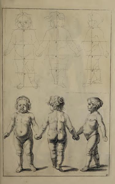 This page includes the number '22' and primarily presents illustrations for artistic study. It features two sets of figures showing young children, moving from simple outlines to detailed drawings, illustrating a methodical approach to figure drawing.