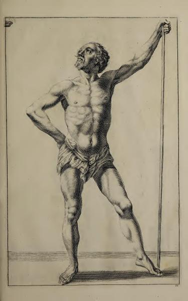 Page Summary: The page contains a detailed illustration of a male figure in a classical pose, showcasing anatomical study in art, typical of the teaching style in Lairesse's 1745 book on drawing. << Go to previous page Go to Beginning of this Book Go to Index of this Book's pages Go to list of Books Go to next page >>