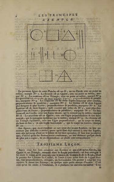 After making the students fully understand what a Circle, a Square, and a Triangle are, as indicated in the previous lesson, they are taught to draw them as well as they can using the Compass and the Ruler. The first is used to form Circles, and the latter to draw all kinds of straight lines, whether perpendicular, oblique, or horizontal. It is promised to the one who performs this the best a print or some other small token of recognition. This encourages them to compete with each other and to engage in friendly banter.