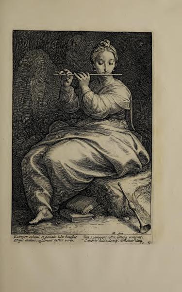The text is a poetic depiction of Euterpe, the muse of music in Greek mythology, highlighting her musical prowess with the flute and her presence in poetic traditions. It alludes to Greek cultural elements, including the Pythian Games and the legendary Aganippe spring. The text intertwines the arts with mathematical harmony, a classical concept.
