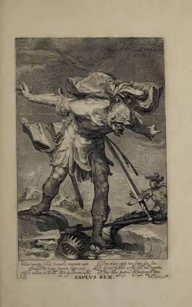 For a long time, the laws given by Samuel would have held Saul, and he was covered in his own blood. But finally, burdened by many faults, he also came to detest his own life. What should he do? With his own hand, as the weapon refused him, he completed the sad task. KING SAUL.