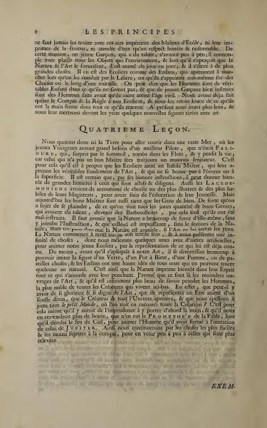 Students should never be treated with those imperious airs of school masters, nor instill fear in them, nor expect honest and reasonable respect from them. In this way, a young boy, who has talent, gradually advances; he observes with pleasure all the objects surrounding him, and when he realizes that nature and art favor him, he becomes more animated each day, rising to greater things. Students are like children, learning to walk along a wall. One can say that men are true infants in what they do not know, and that well-instructed young boys are men before they reach adulthood. We have already made our students put aside the compass and ruler, and praised them for the steady hand in everything they draw. Now, we shall go further, presenting them with new, skillfully drawn figures.