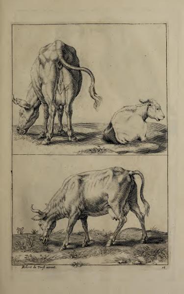 The page contains illustrations of cows and a brief text crediting "Robert de Vost" as the inventor. The text is likely indicating the creator of the illustrations. The illustrations are detailed images used for learning animal anatomy and drawing.