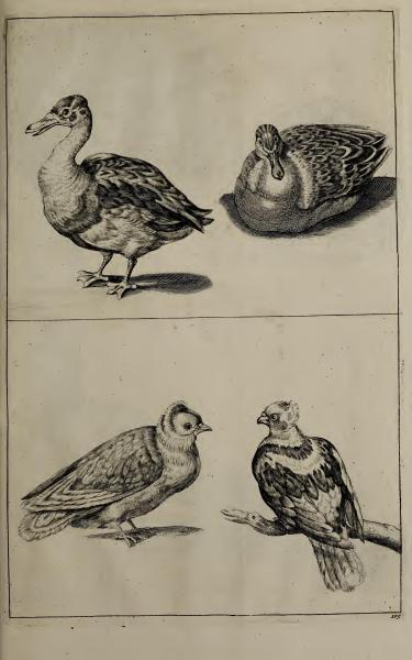 This page contains the number 104 and features illustrations of four birds. There are two ducks and two smaller birds, drawn with detailed engraving techniques typical of the period. The images may have been used for studying avian anatomy or drawing techniques.