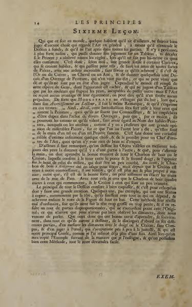 The most important aspect of all Drawing is to start with good outlines, and this requires great attention. Some, for example, who have a statue to copy, begin with the head, finishing everything related to it, and then complete the rest of the figure from top to bottom. This method often fails, whether they've made the head too large or too small, resulting in a composition with disproportionate parts that do not align with the original; this happens only because they've not properly observed the distances discussed earlier. Those who have a good desire to learn should remember, in everything they need to define, to distinguish firstly in its different parts, measuring distances with their fingers or crayon without a compass, and judging by eye, which gradually becomes accustomed to accuracy and becomes our main guide, as I have insinuated more than once. Thus, when you have copied the following example in the manner I teach, and have thoroughly understood this method, everything else will become easy.