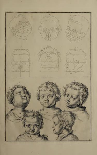 The image contains a page with illustrations and no discernable text. The top section of the page shows a series of outlined diagrams depicting the geometric construction of human faces. These are likely instructional guides showing how to lay out the proportions and structure before rendering the facial details. The lower section of the page contains completed sketches of children's faces, rendered with details and shading to show volume and form.