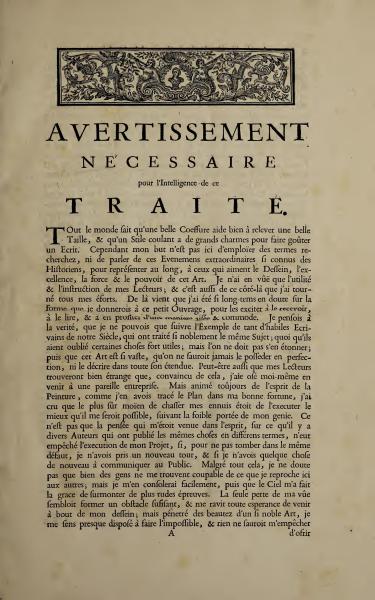Everyone knows that a beautiful hairstyle enhances a fine form, and a flowing style has great charm to make a writing enjoyable. However, my purpose here is not to use elaborate words, nor to speak of those extraordinary events so well known to historians, to describe at length, to those who love drawing, the excellence, strength, and power of this Art. I have only the utility and instruction of my Readers in view; and it is also from this perspective that I have directed my efforts. This is why I have been so long in doubt about the form I would give to this little work, to encourage them to receive it, read it, and benefit from it in an easy and comfortable manner. I thought in truth that I could only follow the example of so many skilled writers of our century, who have so nobly treated the same subject, even though they have forgotten certain very useful things. However, one should not be surprised at this; because this Art is so vast that one can never possess it perfectly, nor describe it in its entirety. Perhaps also my Readers will find it strange that, knowing this, I dared to undertake such an endeavor myself. But always inspired by the spirit of Painting, as I had laid out the Plan in my good fortune, I believed that the surest way to dispel my worries was to execute it as best as possible, according to the limited scope of my genius. Not that the thought that had occurred to me, concerning the fact that several Authors have published the same things in different terms, had not prevented the execution of my Project, if, to avoid falling into the same defect, I had not taken a new turn, and if I did not have something new to communicate to the Public. Despite all this, I do not doubt that many people will find me guilty of what I blame others for here; but I will console myself easily, since Heaven has given me the grace to overcome more severe trials. The only loss in my life seemed to form a sufficient obstacle, and did not take away all hope of achieving my goal; but penetrated by the beauties of such a noble Art, I feel almost inclined to attempt the impossible, and nothing would prevent me from offering.