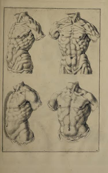 This page in the book "The Principles of Drawing" by Gerard de Lairesse features anatomical drawings of the male torso. It offers detailed views from different angles, focusing on the presentation of muscle structure. The illustrations likely serve an educational purpose for artists studying human anatomy.