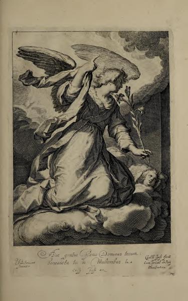 The text translates a Latin biblical verse, "Hail, full of grace, the Lord is with you: blessed are you among women," from Luke 2. The passage is part of the angelic salutation to Mary. The scene likely represents the Annunciation.