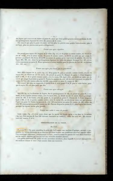 Planche II. The eyeball can be considered as an optical machine, serving to gather light rays into a beam that strikes a nerve membrane called the retina. An outer, membranous, and hard envelope supports all parts of the eye. Inside is a dark coating that makes the eye a true camera obscura. At the front of the globe is a circular opening, in which the transparent cornea is embedded like the glass of a watch in its case.