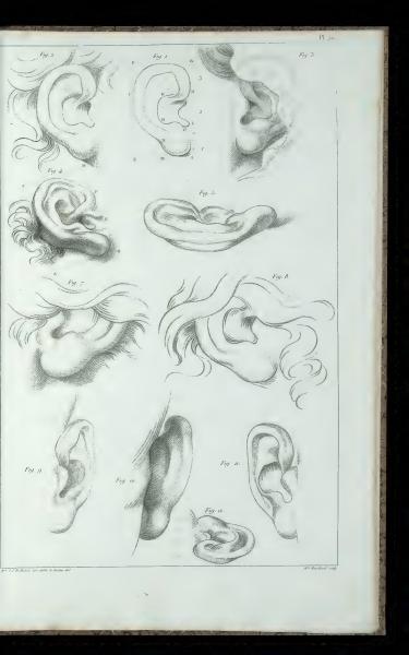 The text provides labels for a series of twelve figures depicting ear drawings. These are crafted by Jarry de Mancy following the teachings of L. Breton. The images are meant to instruct on the realistic portrayal of ear anatomy.