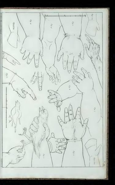 The text provides labels for nine figures depicting studies of hands and a bird. These illustrations are intended for instructional purposes in the context of drawing and art. Each figure label assists in identifying and understanding anatomical structures.