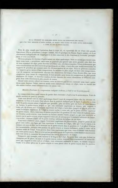 You have an object in front of you whose dimensions you want to compare. With your arm and hand positioned as indicated by the figure 3, plate 4, lower the pencil holder as much as possible, close to your eye, and then raise or lower it until its upper end aligns, level with your eye, with the top end of the object. This means aligning the top point of the object with the upper end of the pencil holder. Then, keeping the holder fixed, raise or lower your index finger on the holder until it aligns level with the bottom end of the object, thus masking the entire height of the object from your view.