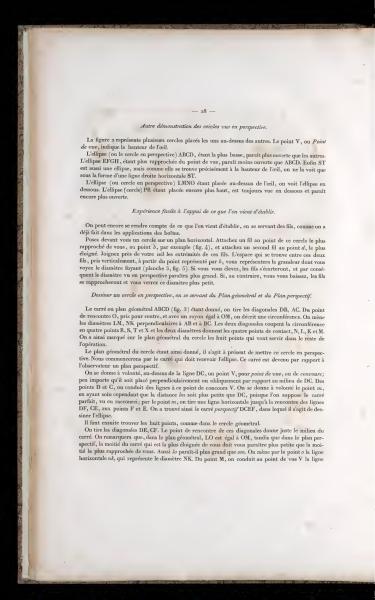 You can further understand what has been established by using threads, as has already been done with box applications. Place a circle in front of you on a horizontal plane. Attach a string to the closest point of this circle to you, at a point ½, for example (fig. 4), and attach a second string to the point d, the farthest. Join the ends of these strings near your eye. The space between these two threads, taken vertically, from the point represented by f, will represent the size of the diameter as you see it (plate 3, fig. 5). If you raise yourself, the threads will spread apart, and consequently, the diameter seen in perspective will appear larger. Conversely, if you lower yourself, the threads will get closer, and you will see this diameter as smaller.