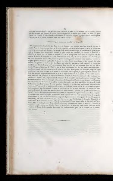 Imagine in the gallery you just depicted, there is a staircase placed to be viewed in profile. To draw it, you proceed as follows: find the width aB by comparing it to the total width AB. Then, focus on the first step, which consists of a geometric plane and two perspective planes, like the base of one of the columns or like the box in plate 3, figure 10. Determine the width a'b' by comparing it with the entire width aB, and similarly find the height a'e' by comparison with a'b'. You obtain a rectangle or geometrical plan a'b'c'd'. You could then proceed to complete this step as for the box in plate 3, figure 10, but it is simpler here to refer to the viewpoint. From points a, c, d, a', draw lines to the viewpoint after assessing how many times the width a'b' fits into a'e'. Here a'b' fits once and a half into a'e'. Therefore, take on the drawing and on the line here represented by a'e', a dimension equal to one and a half times a'b'. Thus you find the point e. Raise a vertical from this point to where it meets the line drawn from e to the viewpoint, with the meeting point being f, from which draw a horizontal line until it meets at g with the line drawn from a' to the viewpoint. Upon completing this step, extend the vertical raised from b' and give this vertical a height d' equal to b'd', representing the height of the second step, as all these steps are of the same height. In the rectangle a'b'c'd', draw the diagonal from d'a' which you extend indefinitely. Through points c and f, draw parallels to this diagonal; these two parallels will receive the profile of the staircase completed in this manner. From point k, draw a horizontal until it meets d'a' at m'; from this point m', raise a vertical that intersects c'd' at n'; from this final point n', draw another horizontal until it meets a'f, and so on. This method outlines every step you wish to draw. Next, from points represented by p,p',m,n,n',m', draw lines to the viewpoint or vanishing point of the first step. Then, from point q, raise a vertical until it meets the line drawn from r to the viewpoint, from k to e intersection point, draw a horizontal to the line from m to the viewpoint. From any interior point j, raise a vertical, etc. The inclination of the profile depends on the depth of the first step. The shorter the rectangle a'b'c'd', the straighter the diagonal a'c'. Conversely, the longer this rectangle, the more slanted the diagonal. In the latter case, the slope is gentler. In beautiful staircases, the top of the step should have a depth of one foot, and the step height should be five inches.