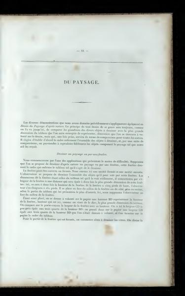 We begin with an application that presents the least difficulty. Suppose one intends to draw from nature a landscape seen through a window, with the window itself forming the frame of the drawing. The window may be open or closed. Here, we have one half closed and one half open. The observer aims to draw all the objects visible through this window. Since the dimensions of the window are those of the composition as seen, one must start by moving away from the window a distance equal to twice the largest dimension of this window; here, it will be twice the height of the window. If the window is five feet high, the observer will move ten feet away. They should position themselves either directly in front of the middle of the window or to the side, depending on the part of the composition that is of most interest. Here, we assume the observer is directly in front of the middle of the window.