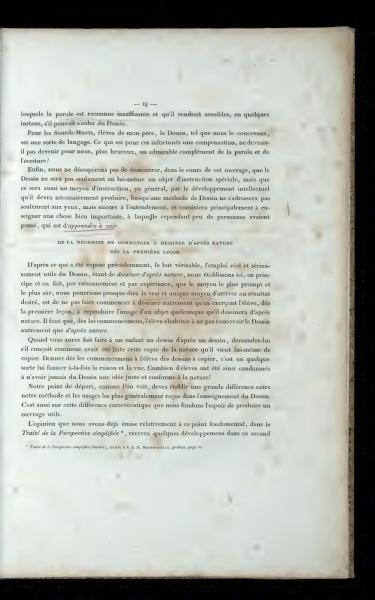 Based on what has been previously stated, the real goal, the actual and serious use of Drawing, is to draw from nature, we establish here, in principle and in fact, through reasoning and experience, that the most prompt and reliable method, we might almost say the true and unique way to achieve the desired result, is to not start drawing in any other way than by training the student, from the first lesson, to reproduce the image of any object they will draw from nature. It is necessary that, from the beginning, the student gets used to not conceive Drawing other than after nature.