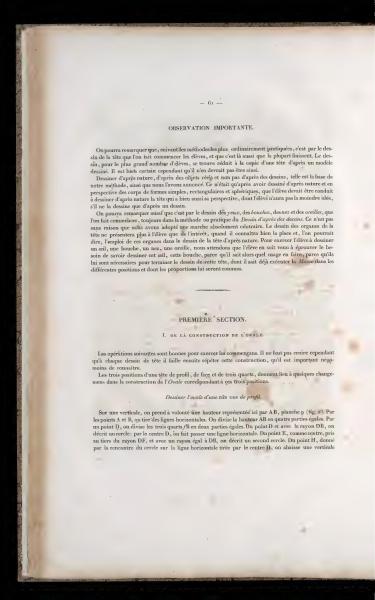 It should also be noted that starting with the drawing of eyes, mouths, noses, and ears is common in methods or practices of drawing from drawings. It is not without reason that we adopted an entirely opposite approach. The drawing of facial features will only hold the student's interest when they know well the placement and, one might say, the use of these features in the drawing of the head from nature. To train the student in drawing an eye, a mouth, a nose, an ear, we wait until the student feels the need to draw this eye, this mouth, because they know then what use to make of them, because they are necessary for completing the drawing of this head, which they already know how to execute the Mass in various positions and whose proportions they will know.